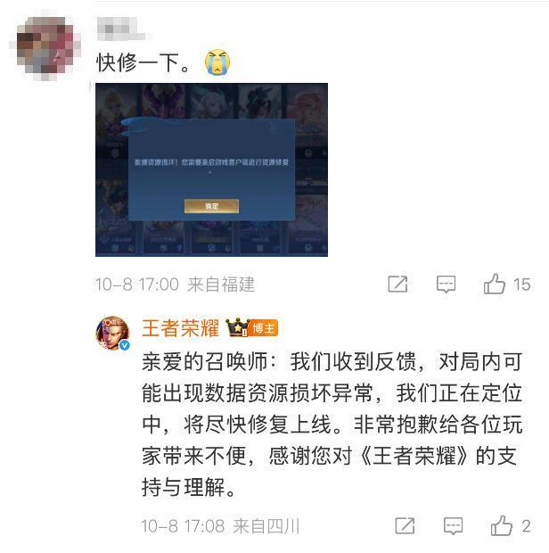 10月8日,不少网友称游戏《王者荣耀》出现提示“数据资源损坏!您需要重启游戏客户端进行资源修复”以及带来玩家信誉分被扣等问题。